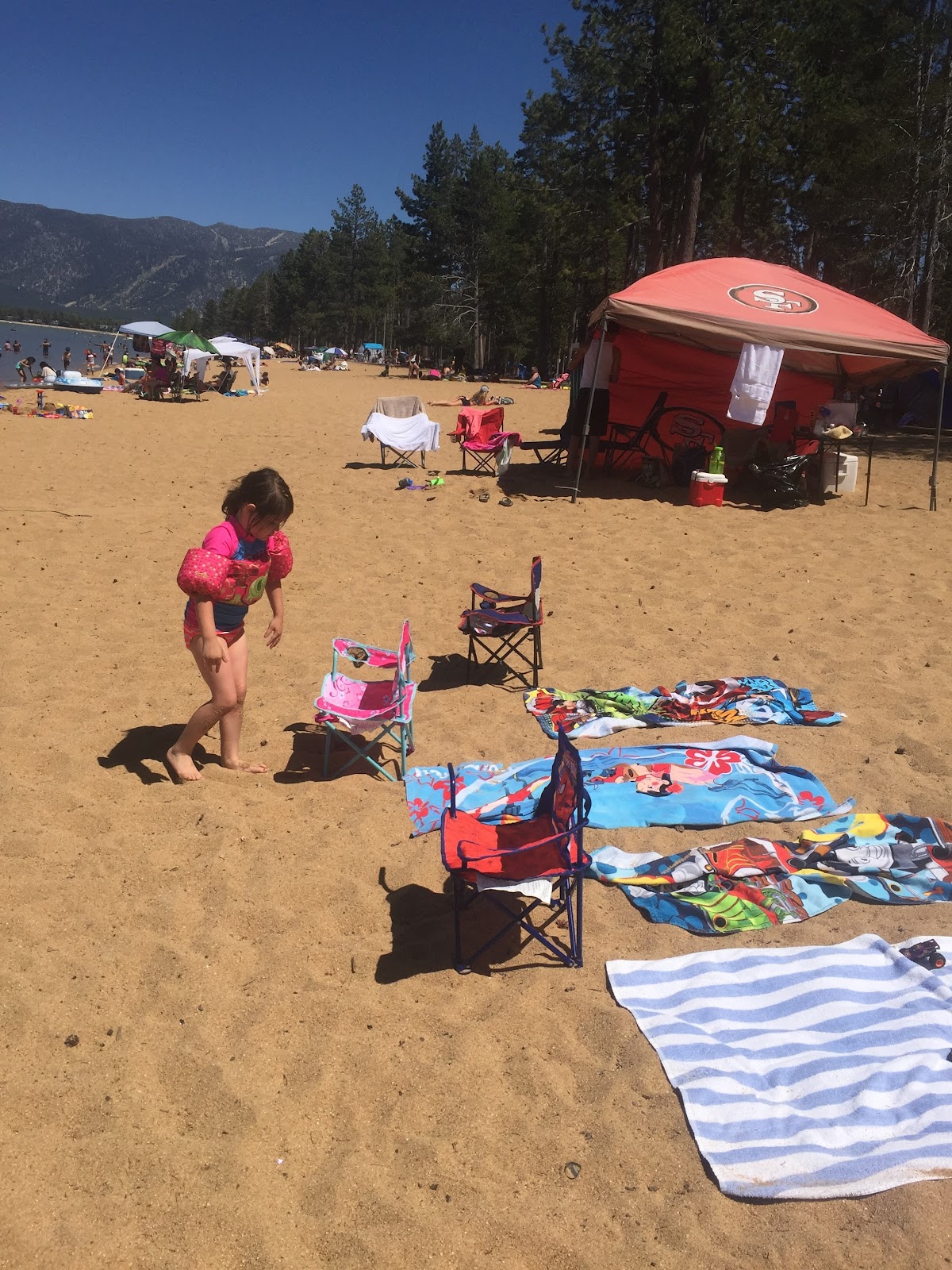 Over the course of our ten days at Tahoe, we went to the beat at South Short three times and we spent one day at the beach up North in Incline Village with the kids' pre-school friends Brianna and Shannon to celebrate those girls' birthdays. That beach boasted a rocky shore that was less conducive to running in the lake and the boys stuck to the inflatable boat they'd talked us into buying at Raley's. And then we spent the most time at the adjacent pool, playing in the deep end and wearing life vests.